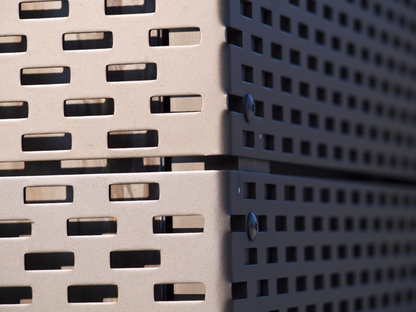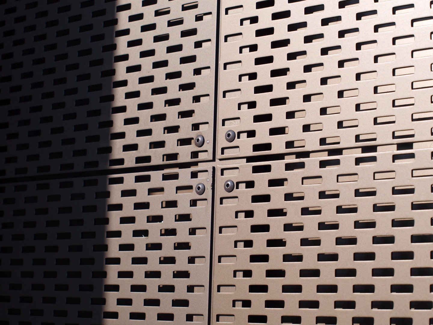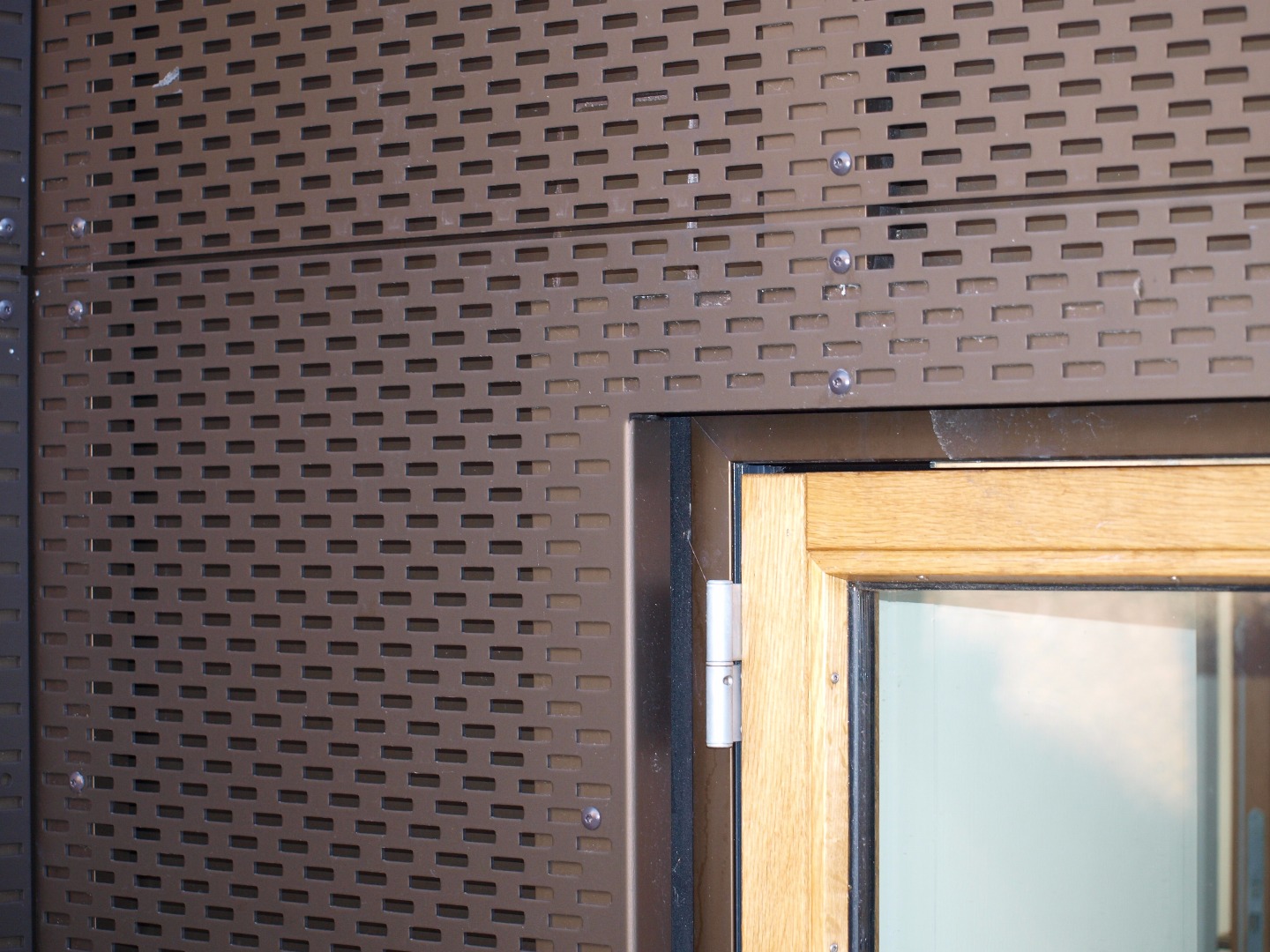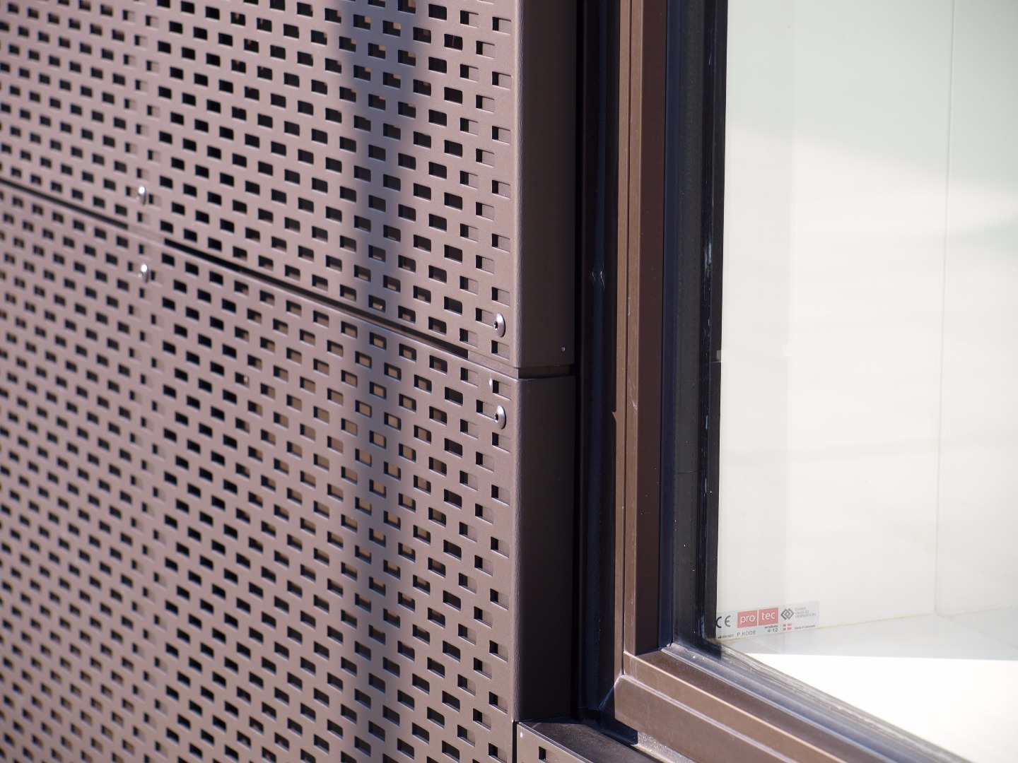 Facaderne består af en 1mm anodiseret bagplade, anodiserede montageprofiler med afstandsprofil og en 3mm perforeret og anodiseret 3mm foran liggende aluminiumplade. Den foranliggende plade er perforet med firkantet hul 22x7mm fordelt på et gennemgående murstensmønster og efterfølgende bukket omkring hjørner og lysninger. Overfladen er anodiseret i mørk bronze farve efter perforering og kassette ombuk, På den måde har vi sikret at farven ligger i alle kanter på perforeringen.