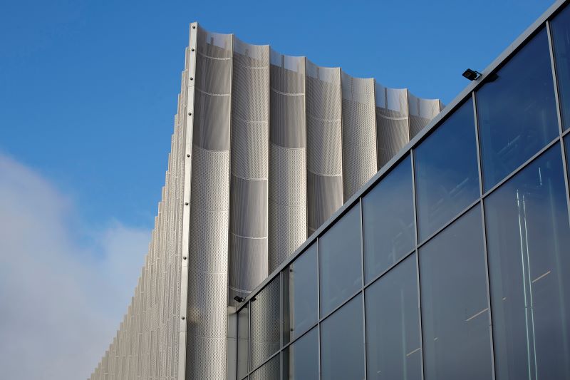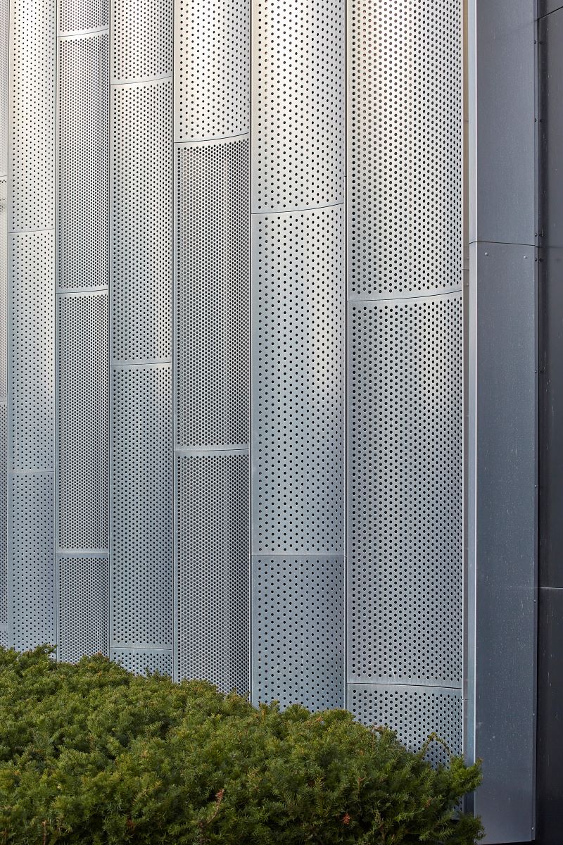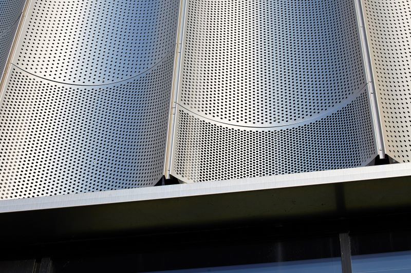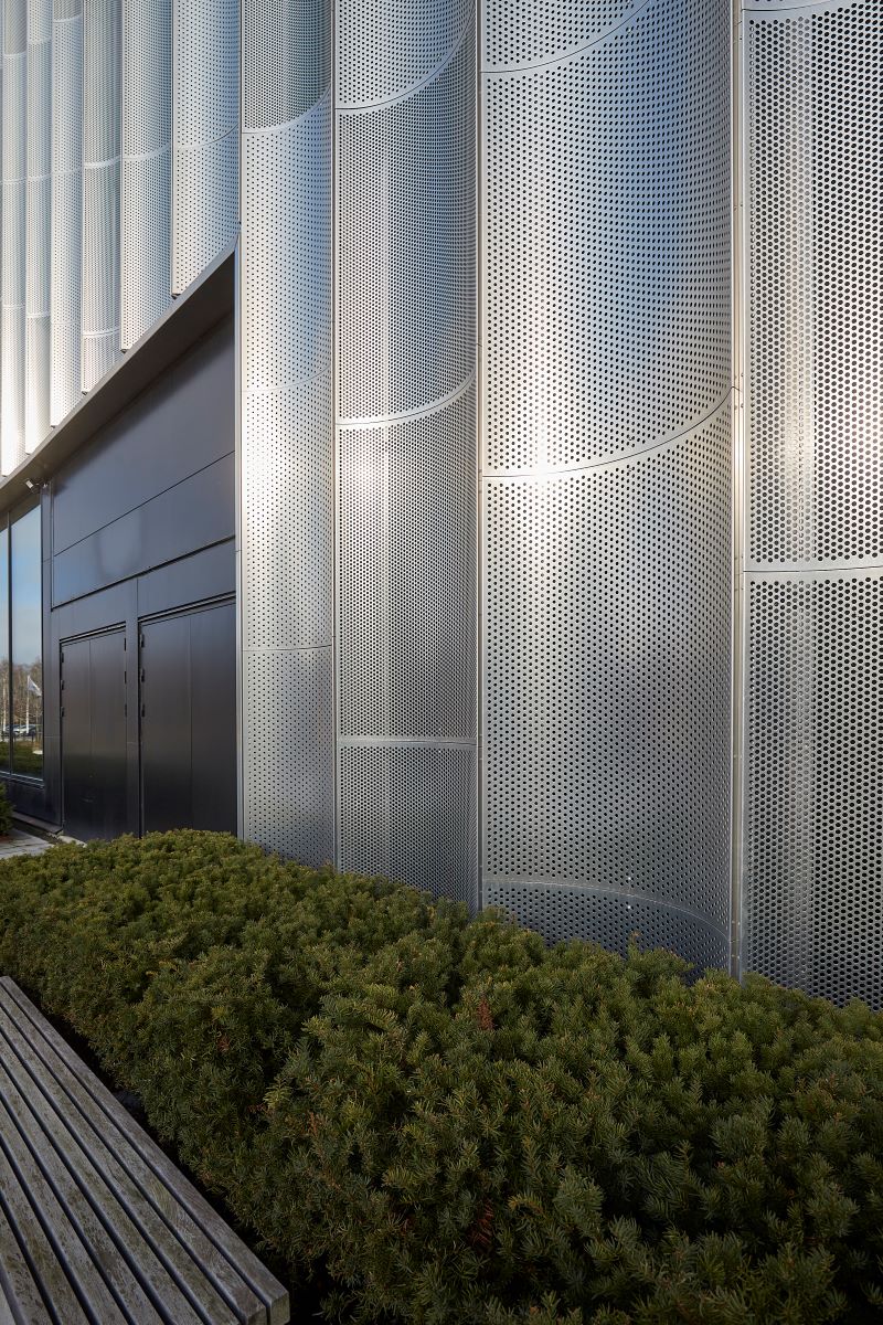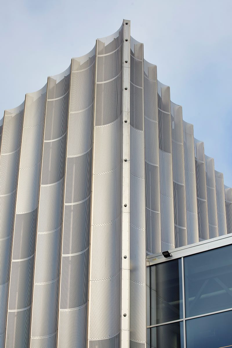 Løsningen blev en bølgende facade af perforerede aluminiumplader i tre forskellige mønstre, som åbner facaden og skaber et levende udtryk. Hver plade er valset til en halvcirkel, så der er en bølgeeffekt gennem hele facaden.