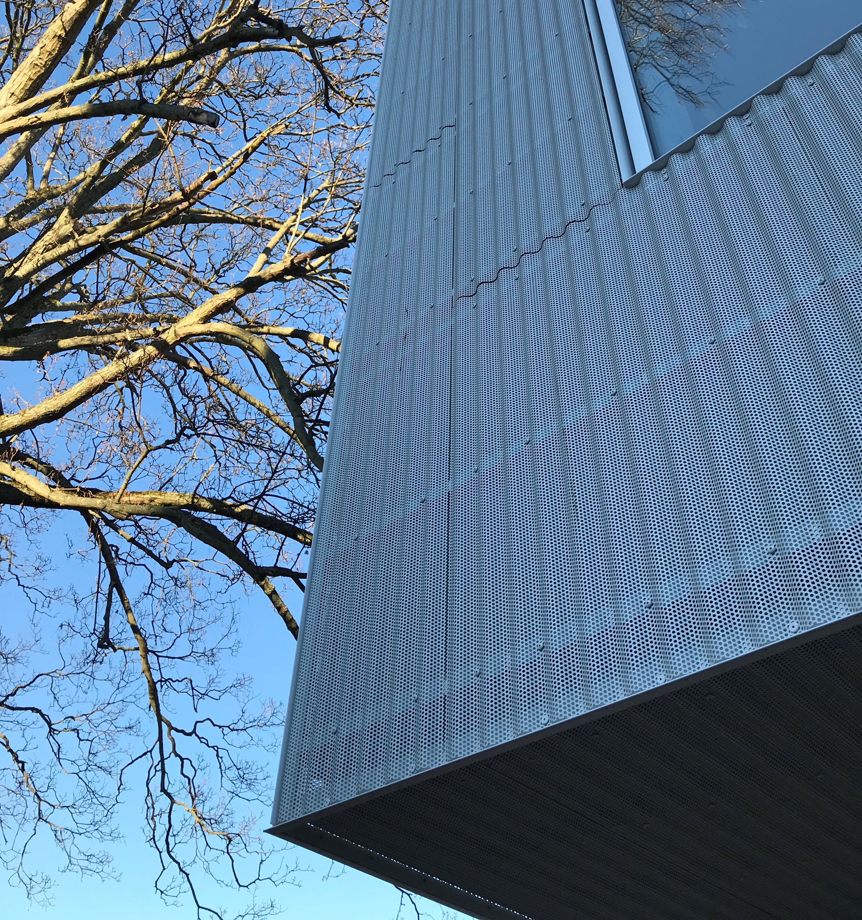 Arkitektens grundtanke med bygningen var, at et let og åbent ydre skulle kombineres med et indre, der var både råt og varmt. Facadens perforerede sinusplader hjælper det lette udtryk på vej og gør bygningen indbydende.