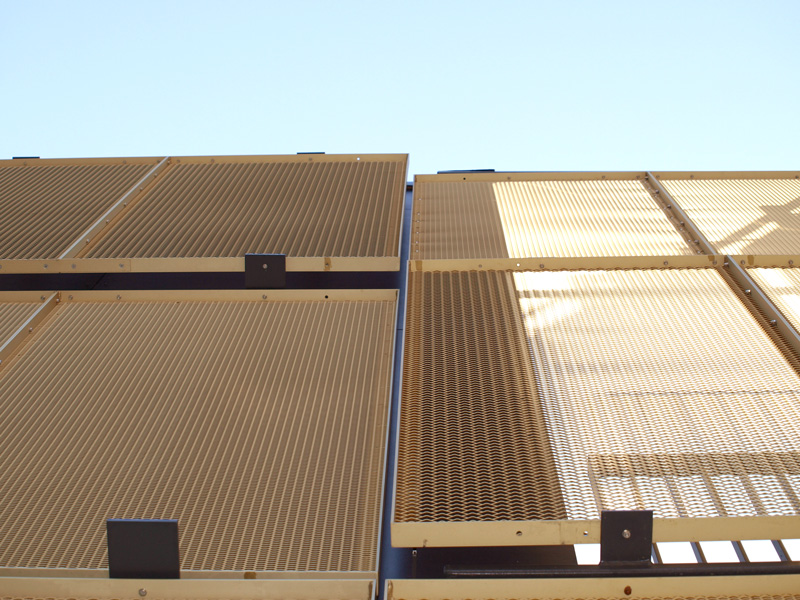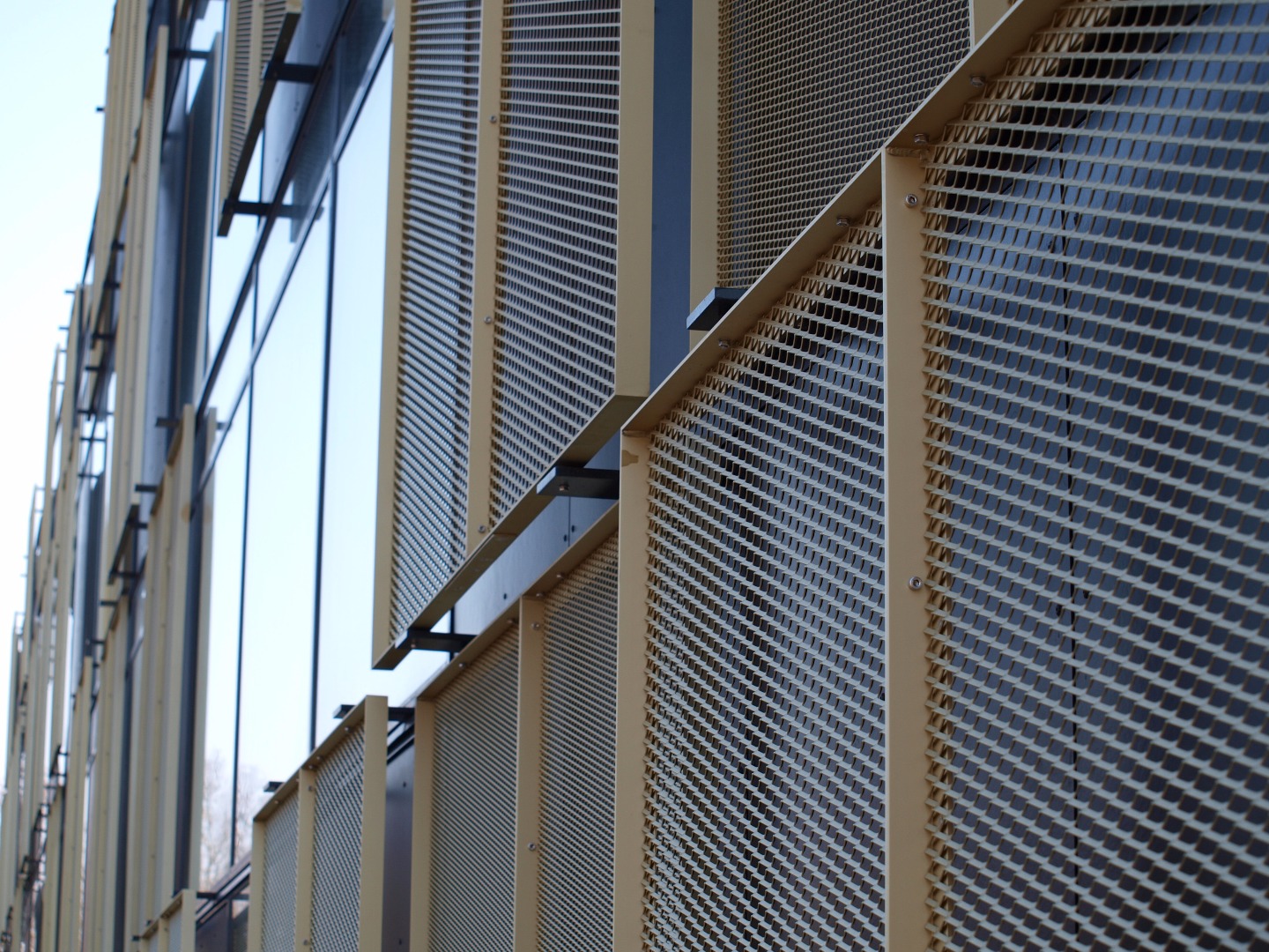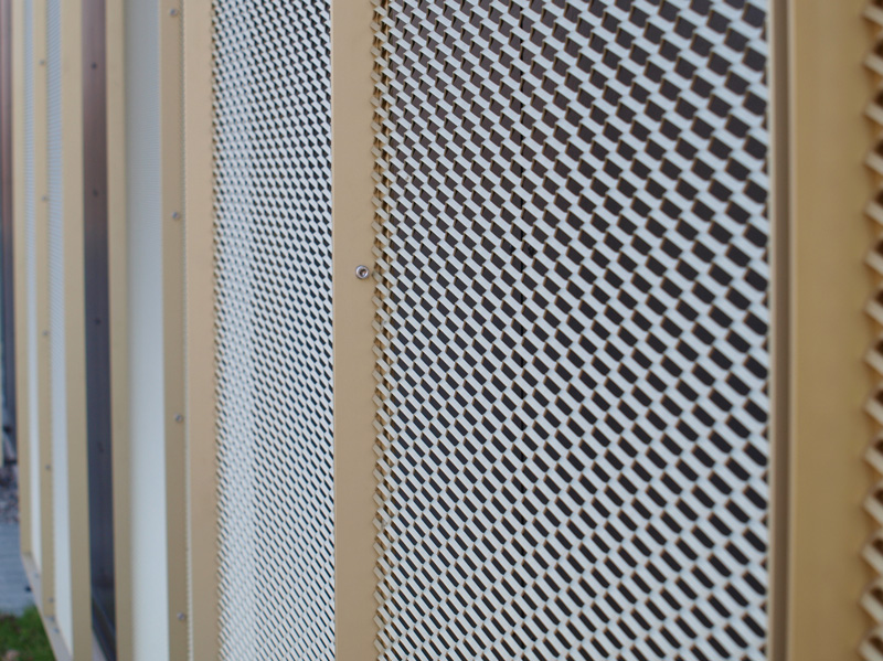 | Materiale | Aluminiumplader i strækmetal med maskestørrelse R62x23-6x2 mm samt R43x12-3,4x2 mm. Strækmetallet er påsvejst rammer af L-profiler i aluminium 50x50x6 mm. De færdige rammer er anodiseret i guldfarve, 20 µm |