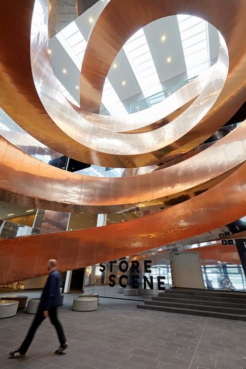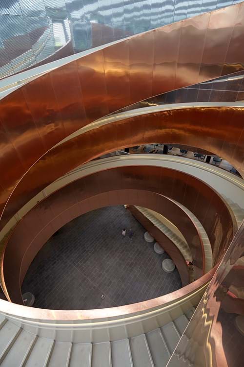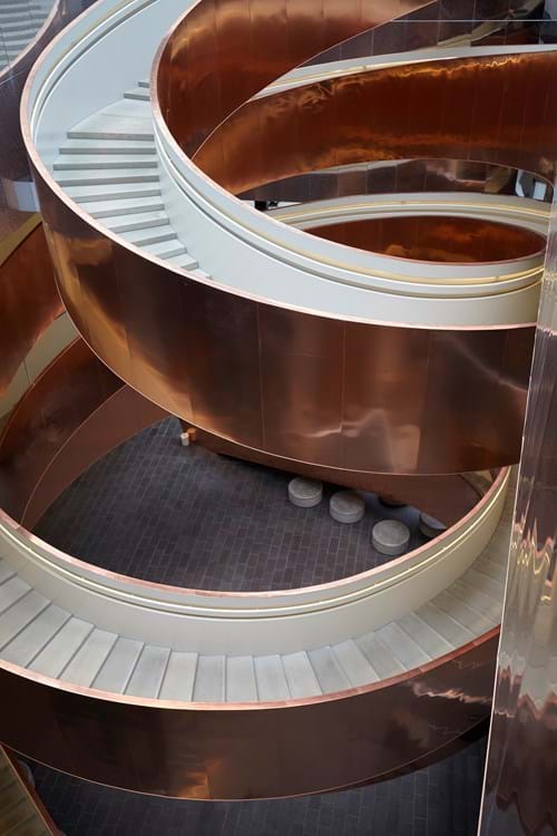 Den imponerende trappekonstruktion er designet af CEBRA Architecture og udført af CSK Stålindustri A/S. AE Stålmontage A/S har stået for kobberbeklædningen. Trappen er beklædt med cirka 10 ton TECU Classic kobber med en tykkelse på 0,70 mm. Kobberets ekspressive overflade tilfører i fællesskab med konstruktionens udformning den nyopførte trappe et fascinerende og imponerende udtryk, der møder de besøgende fra start.