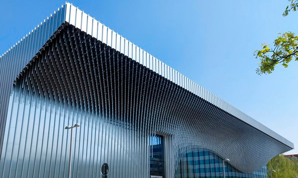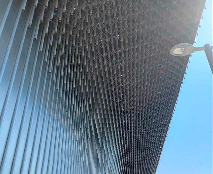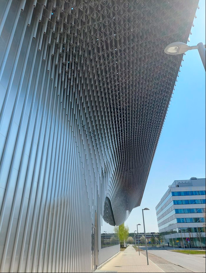 Til dette projekt i Stockholm har vi leveret børstede sandwichplader fra Alucobond og børstede aluminiumsrør med samme overfladefinish som facadepanelerne. Installationen er lavet både udvendigt og indvendigt, og udfordringen har været at levere aluminiumsrørene til installation i den rigtige længde og rækkefølge for at opnå det rette arkitektoniske udtryk.