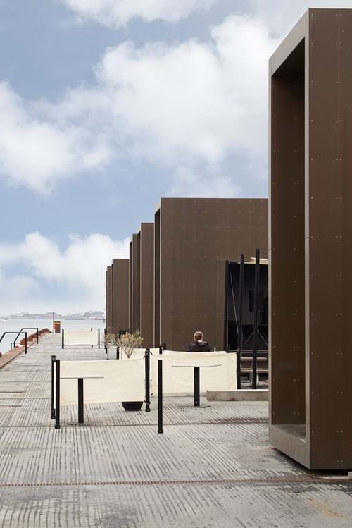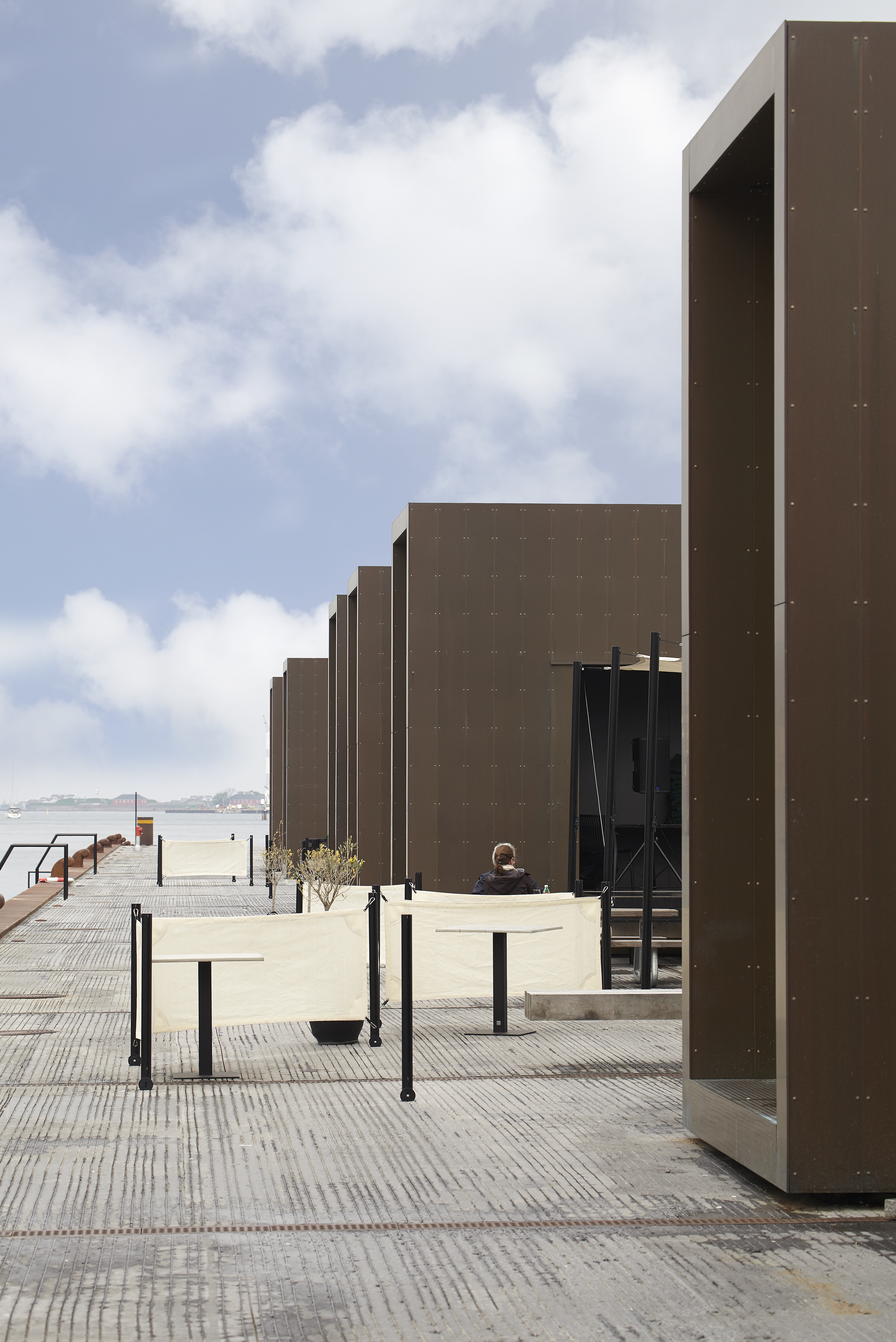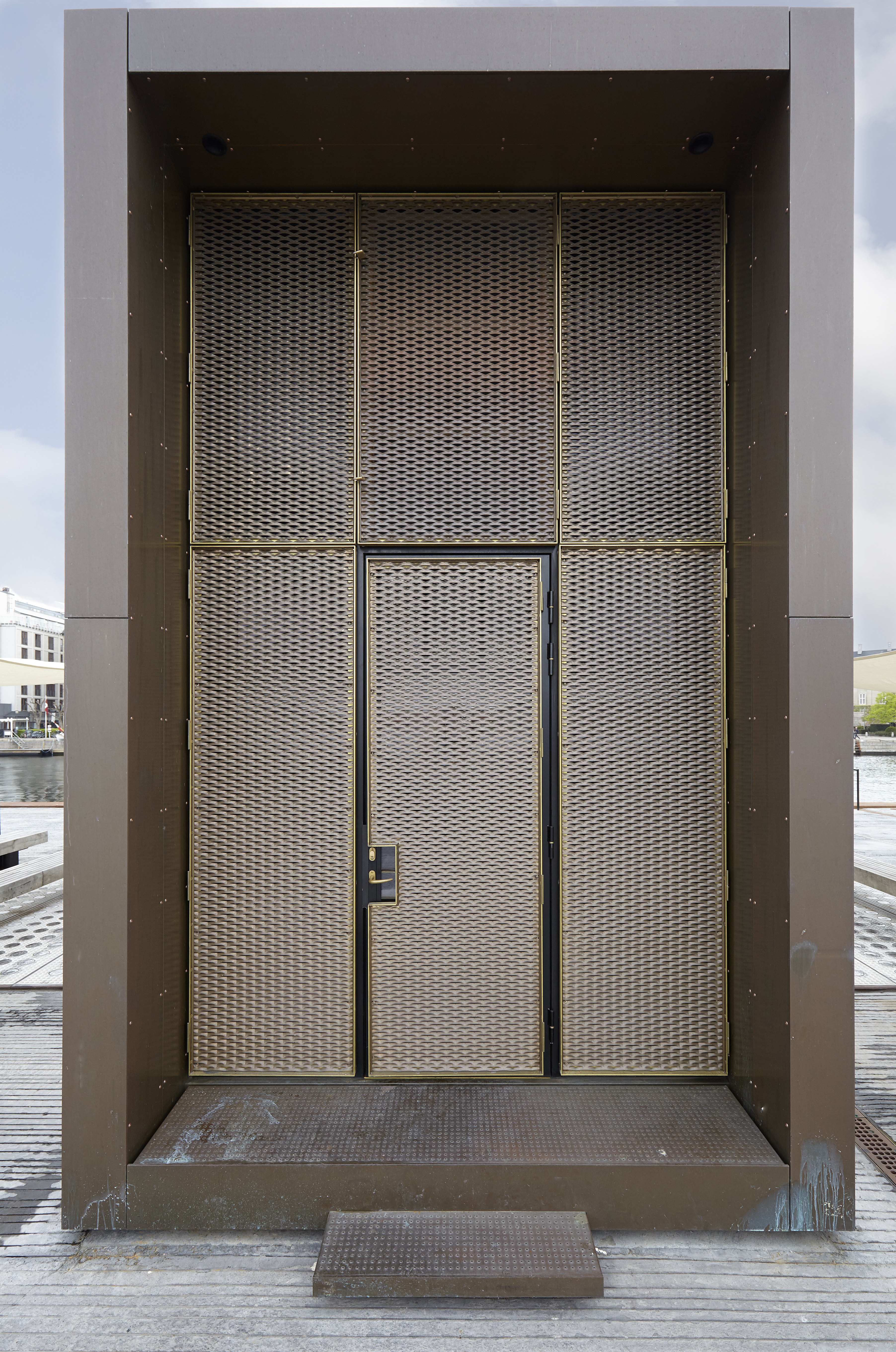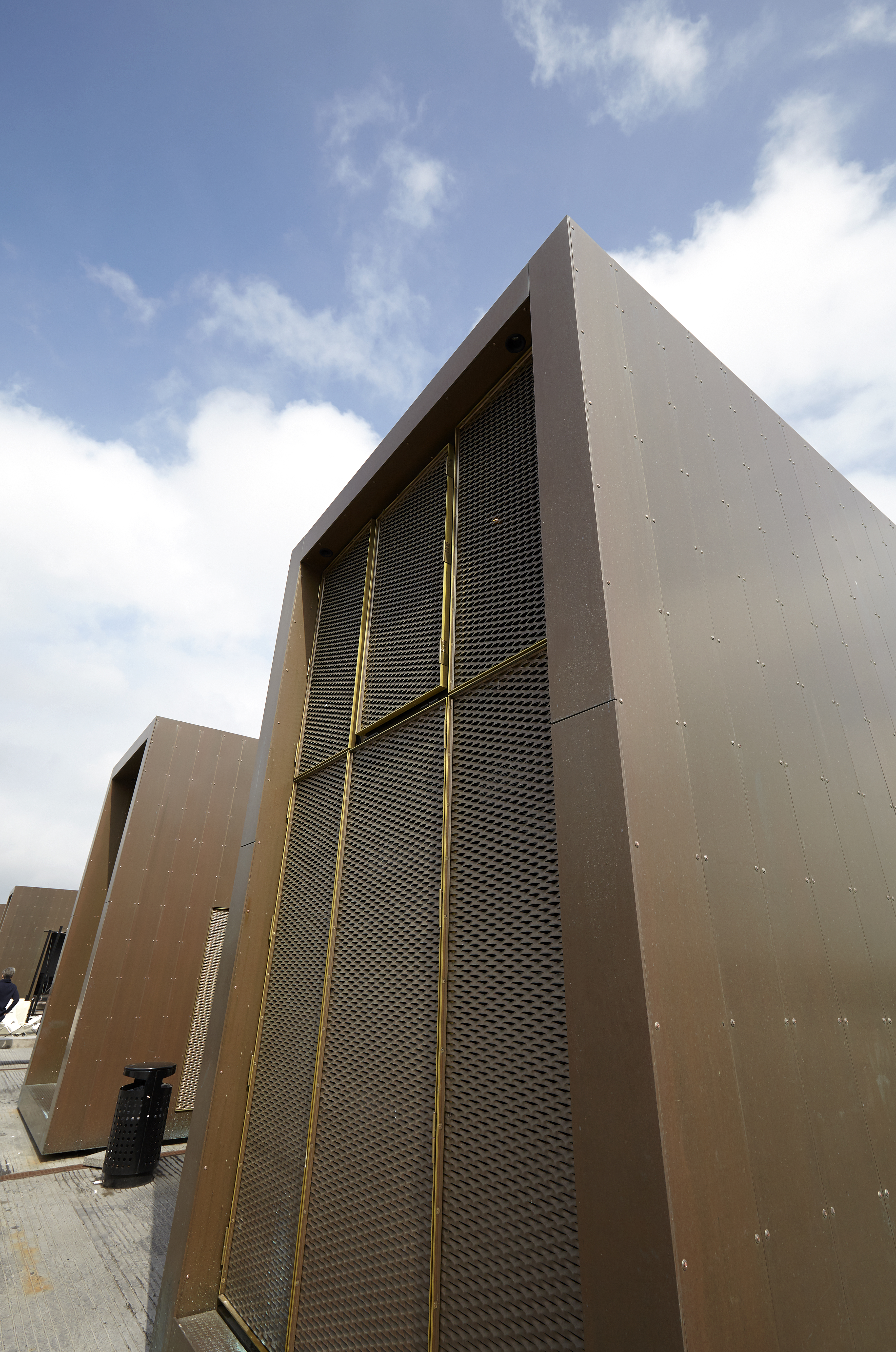 Pavillonerne er beklædt med Tombak CuZn15, der er et KME-materiale, som er leveret af Metalcenter Group. Udførelse af facaderne er meget speciel, da det fra start var ønsket, at man kunne se de tykke plader foran på pavillonerne.