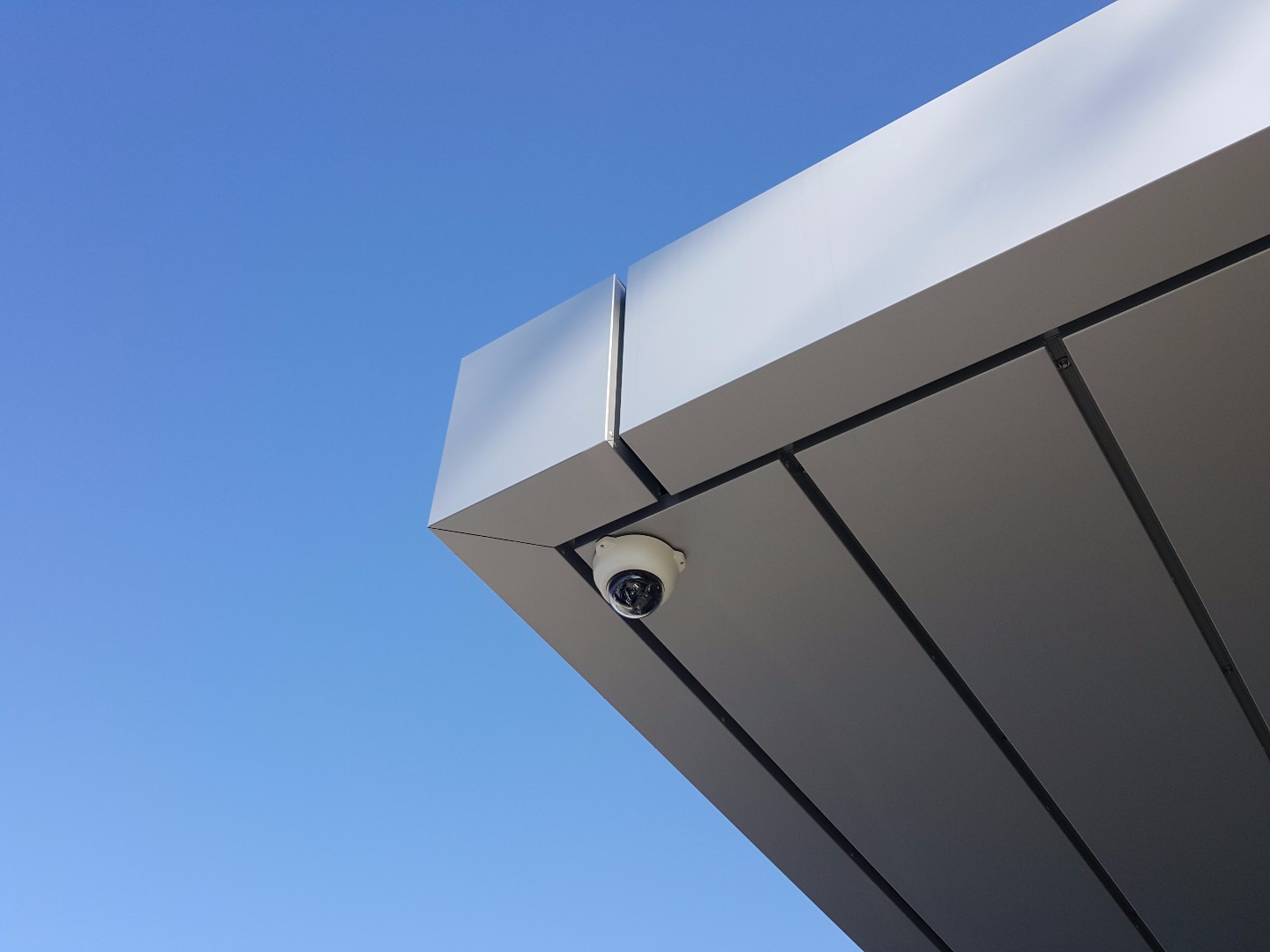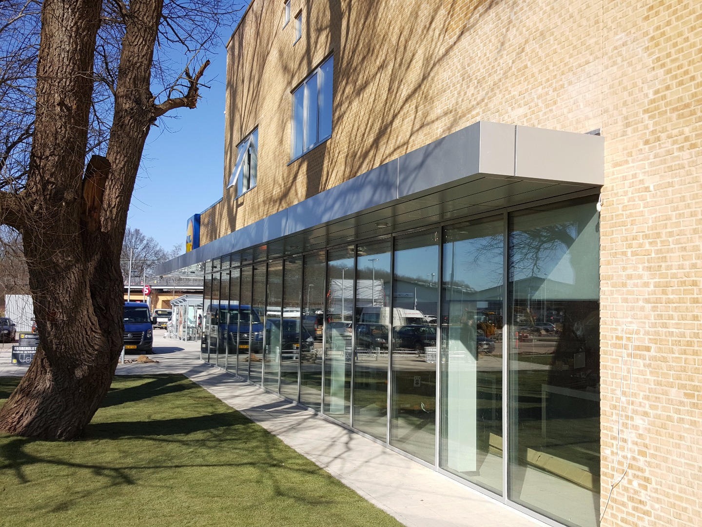 Udvendig beklædning på væg, stern og loft omkring butikkens indgangs- og vinduesparti er udformet med Alucobond-kassetter i farven Silver Metallic 500.