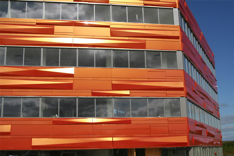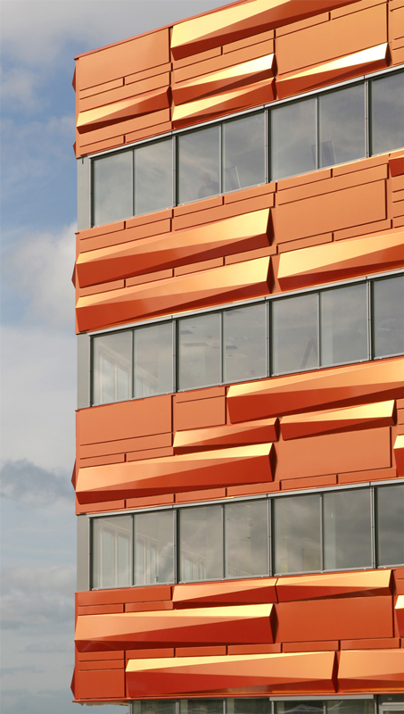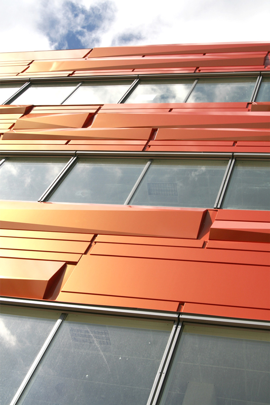 Facaden er beklædt med Alucobond sandwichplader i en Spectra farve, der ændrer sig alt efter hvilken vinkel man ser den fra.