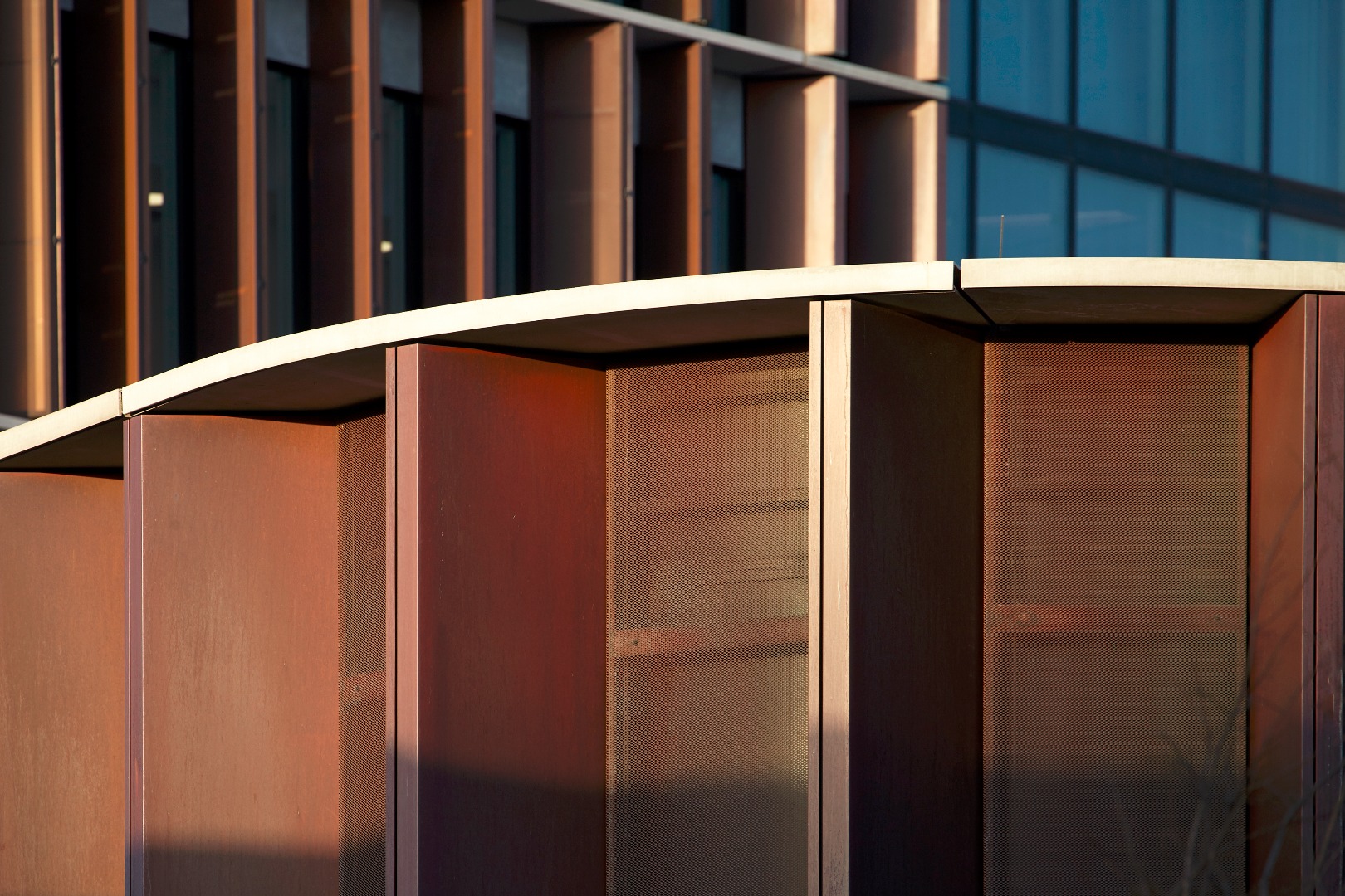 Materialerne er ved montering gyldne, og opnår ved patinering en dybere, mørkere farve, der smukt understreger materialets former. Bygningens arkitektoniske udformning understøttes derved på en elegant måde af metallet, der sikrer, at Panum også i fremtiden vil fremstå som en æstetisk perle.