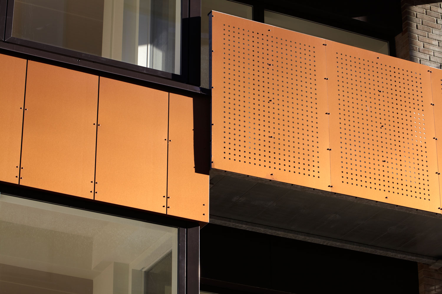 Udvendig beklædning af Facader og Altaner er udført med Alucobond Plus naturAL COPPER 412 På altanerne er plader perforeret med ø15 mm huller i 45 mm rektangulær inddeling. Underlaget er opbygget med aluminium beslag og hatteprofiler.