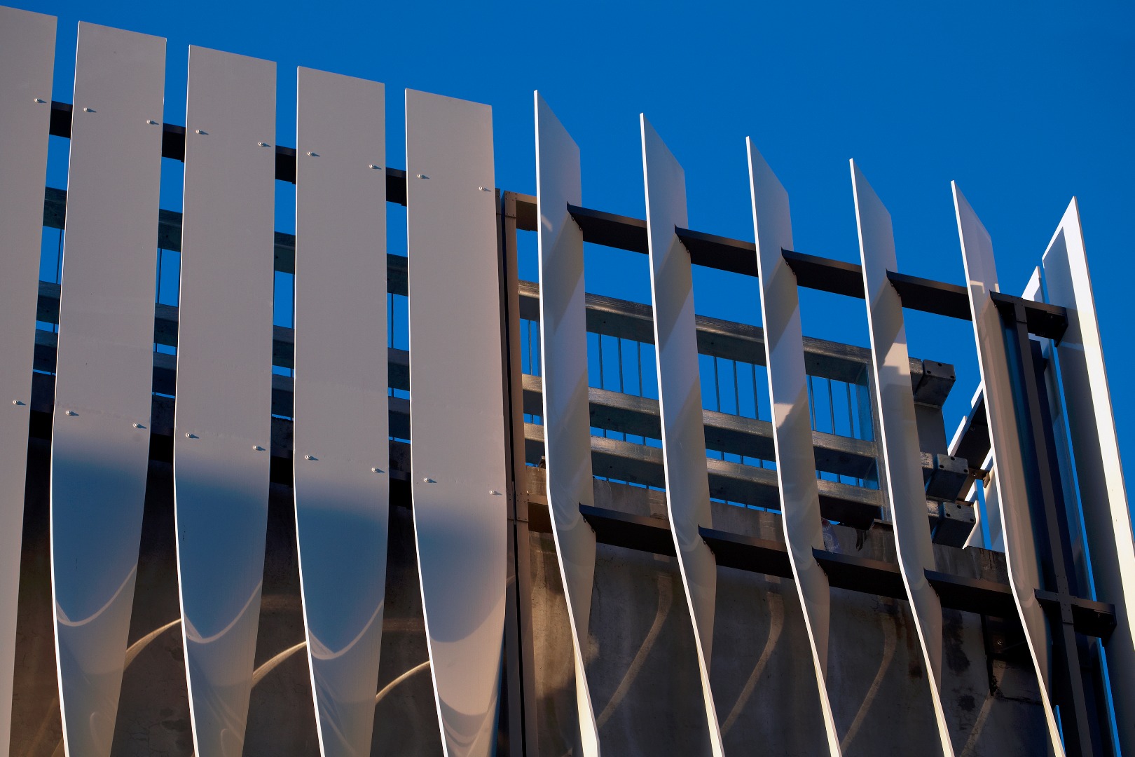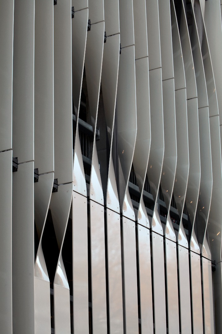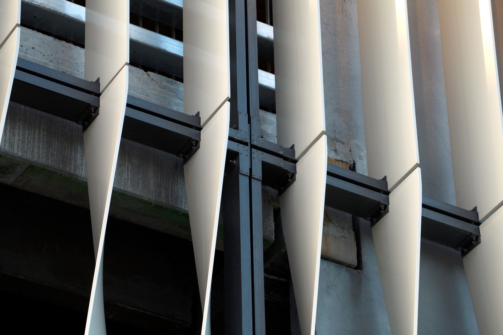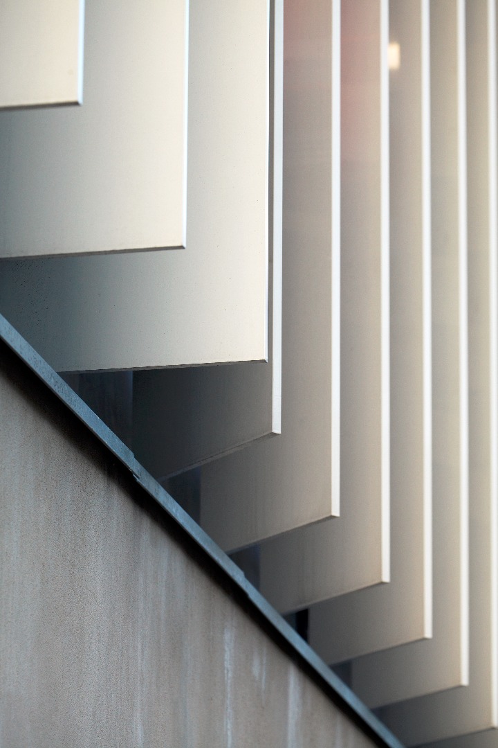 De mange profiler fungerer som lameller i forskellige længder og er monteret på beslag. Det gør, at de kan drejes efter solens position - med den bonus, at facaden bliver levende at se på.