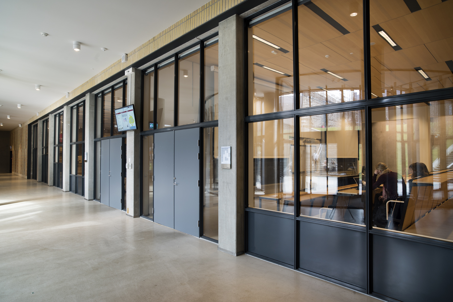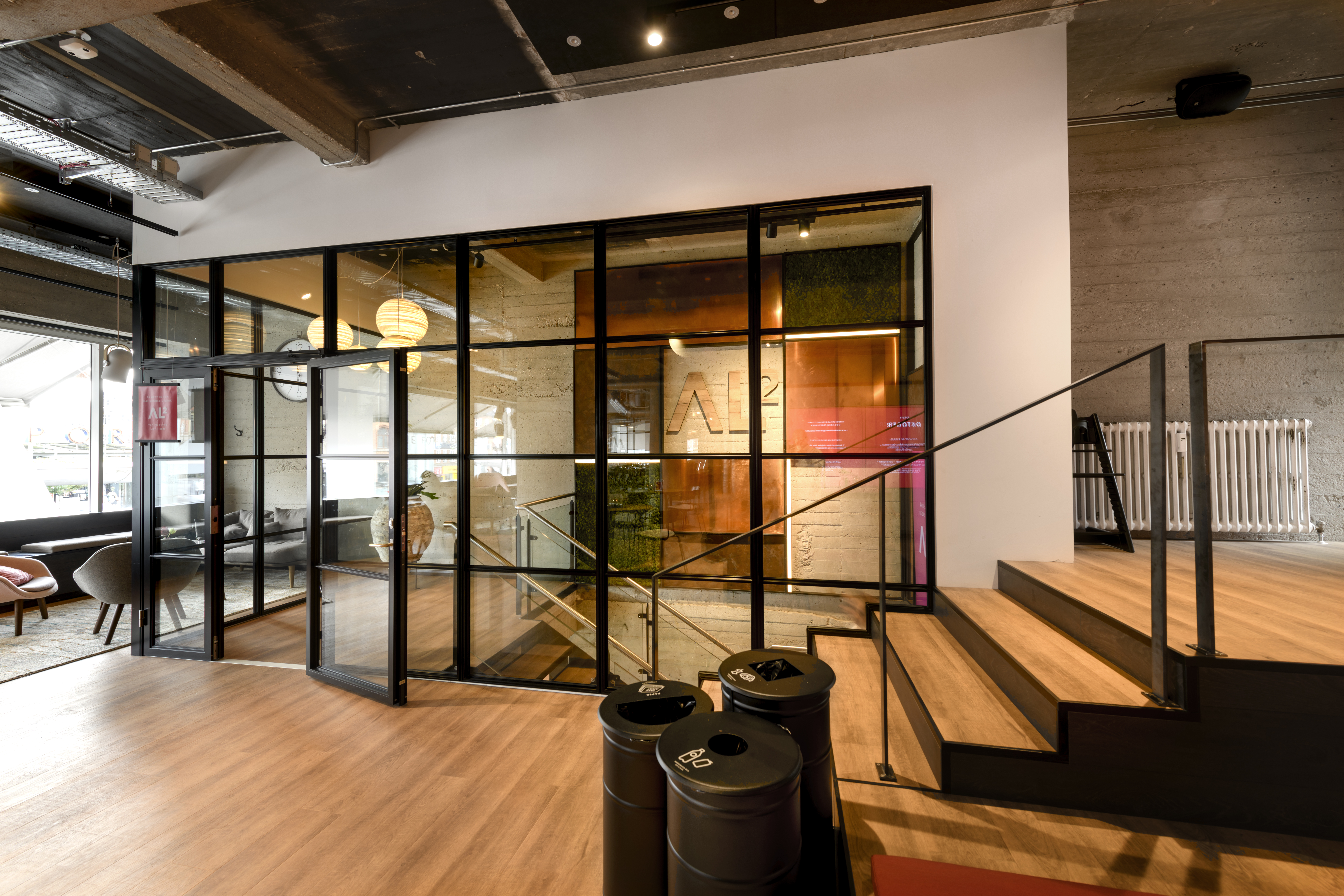 SKANDI-BO bruger aluminiumprofiler til rammerne på de glasvægge og -døre, som virksomheden er kendt for. Glasvæggene giver en effektiv rumopdeling, samtidig med at dagslyset kommer til gavn i flere rum.