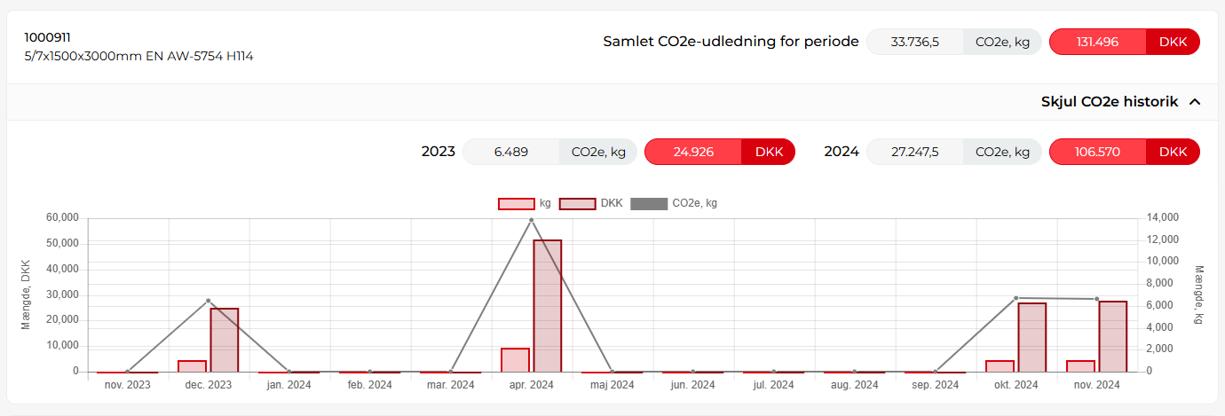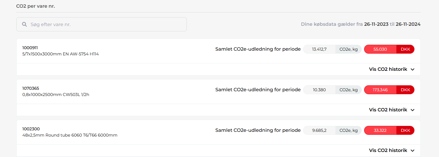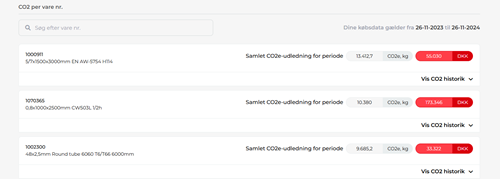Du kan downloade CO2-tallene for de produkter, du har købt hos Alumeco. Du kan se en samlet opgørelse over en bestemt tidsperiode eller udledningen for hvert enkelt varenummer – eller en kombination af de to.