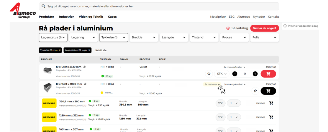 Når du er logget ind i webshoppen på alumeco.dk, kan du se på den enkelte vare, om der er rester på lager. Ved at trykke på ”se restvarer” folder du listen ud, så du kan se den samlede beholdning af materialet.
